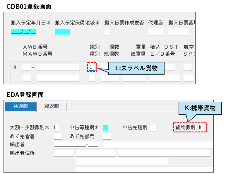 可能です。CDB01(輸出貨物情報登録)により未ラベル貨物(貨物識別「L」)として登録し、