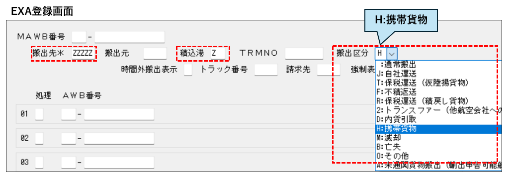 その後は、EXA01(搬出確認登録(AWB・HAWB単位))によりシステム外に搬出(搬出保税蔵置場「ZZZZZ」、