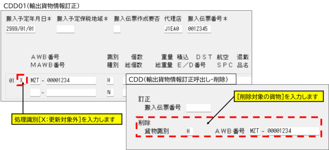 CDD01にて削除したいAWB番号の処理識別欄に「X」(更新対象外)を入力・送信することにより、