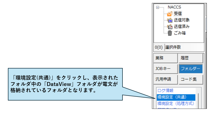 更新日 2025年09月26日 送受信電文一覧画面の受信フォルダ、送信済みフォルダに保存されている電文はパソコンのハードディスク上どこのフォルダに入っていますか。 パッケージソフトのメイン画面の左にある[フォルダ参照]タブ上の「環境設定(共通)」をクリックすると、 エクスプローラで「¥NACCS¥Common」フォルダが表示されます。 表示された「¥NACCS¥Common」フォルダ配下の「DataView」が、電文が格納されているフォルダとなります。