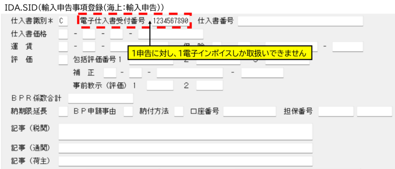 更新日 2025年09月26日 同一輸入者宛に2B/Lの輸入貨物があり、それぞれ電子インボイス受付番号を通知されています。 この2件の電子インボイスを1輸入申告にすることは可能ですか。 輸入申告は5B/Lまで1申告で処理可能ですが、IDA(輸入申告事項登録)業務の電子インボイス受付番号欄は 1欄しか設けていません。従ってシステム上複数の電子インボイスを1申告で取り扱うことができません。