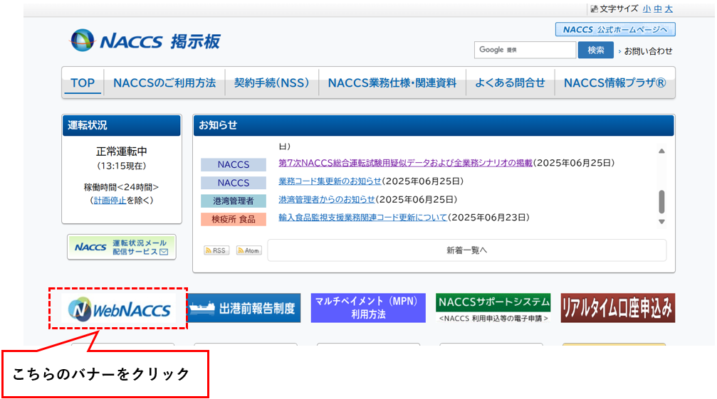 NACCS掲示板のトップページにWebNACCSのバナーがございますので、そちらからアクセス可能です。