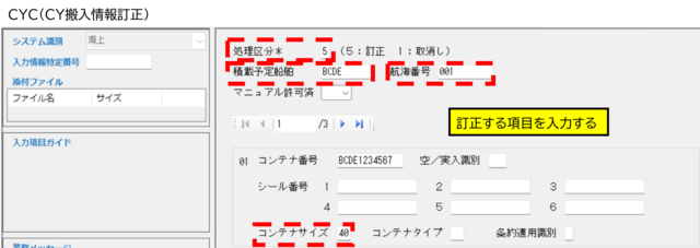 誤りがあった場合は、搬入先CYでCYC11⇒CYCで訂正が必要になります。