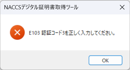 デジタル証明書取得ツールに認証番号1~3を入力後、「E103」エラー(認証コード3を正しく入力してください。)が出力されます。