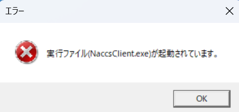 パッケージソフト起動時に「実行ファイル(NaccsClient.exe)が起動されています。」が出力されます。