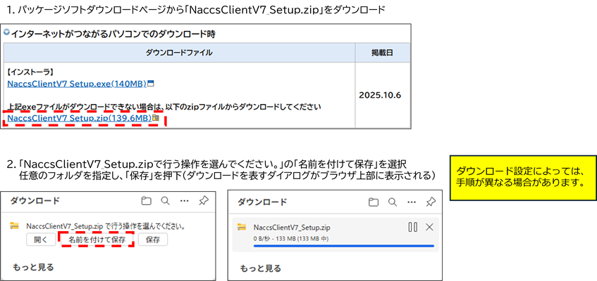 - 「NaccsClientV7_Setup.zipで行う操作を選んでください。」の「名前を付けて保存」を選択
